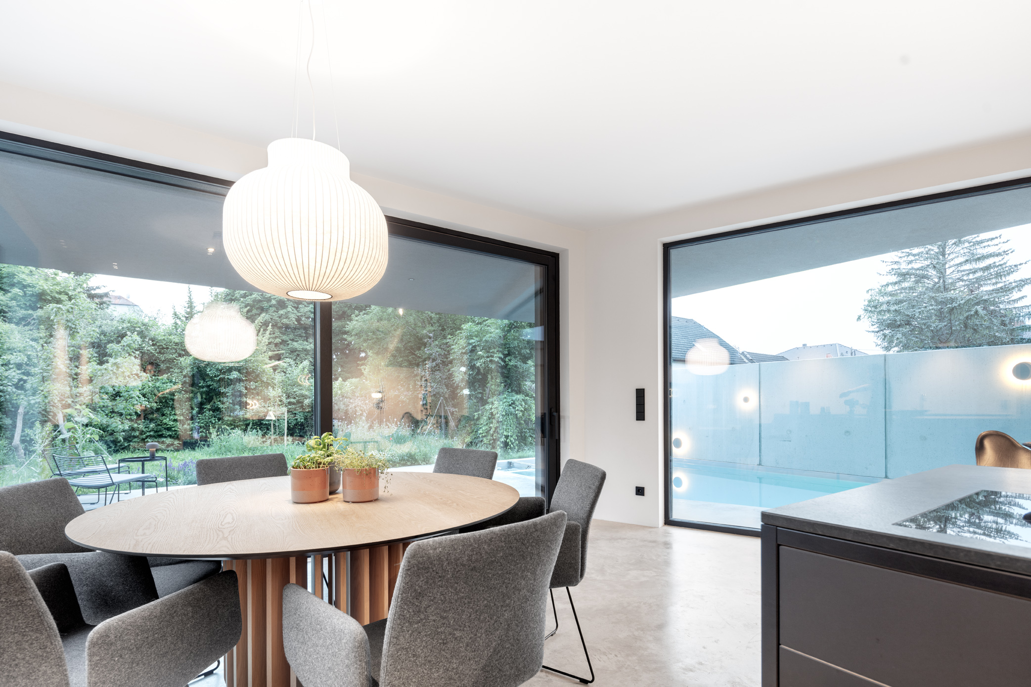 überzeugt mit einem klaren, modernen Entwurf, der Offenheit und Geborgenheit für eine junge Familie in Korneuburg vereint. Die Architektur verbindet minimalistische Eleganz mit großzügigen Blicken in den Garten und viel Raum für gemeinsames Leben.