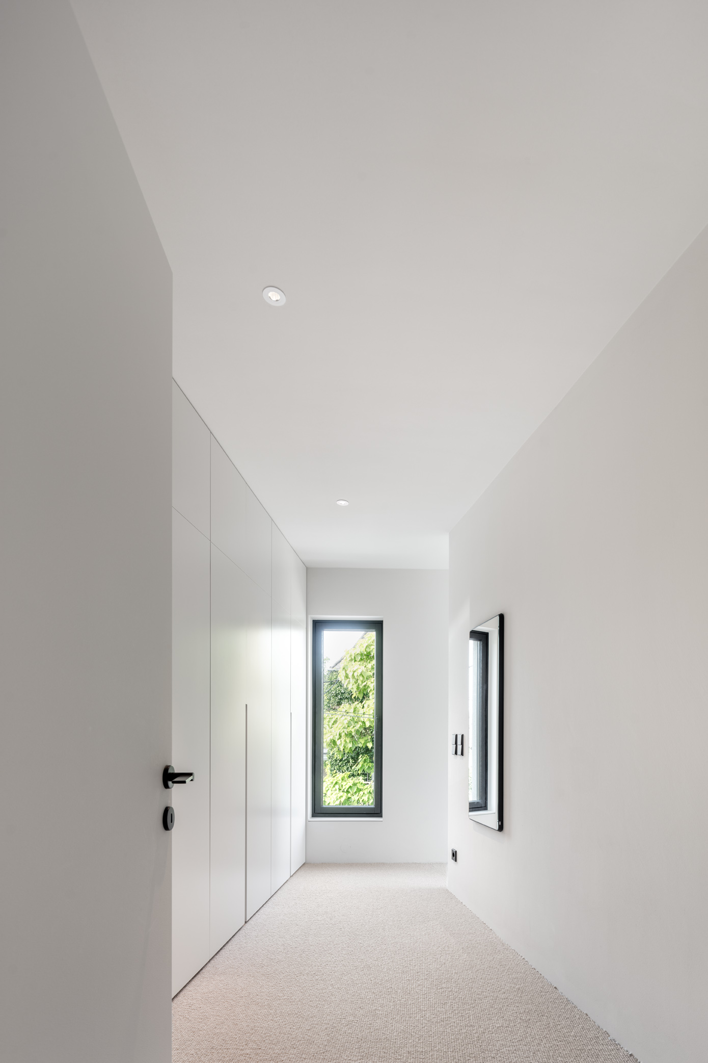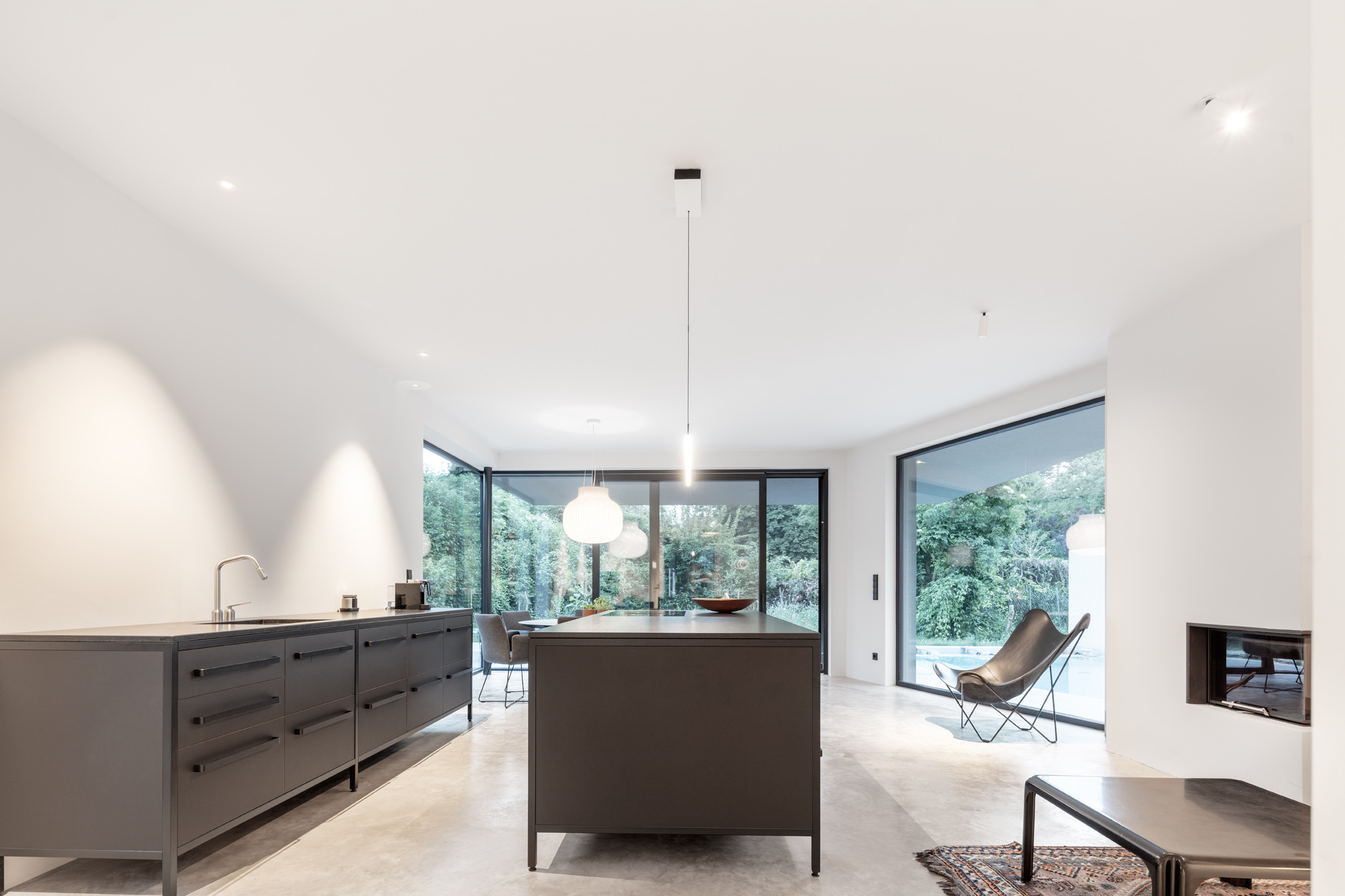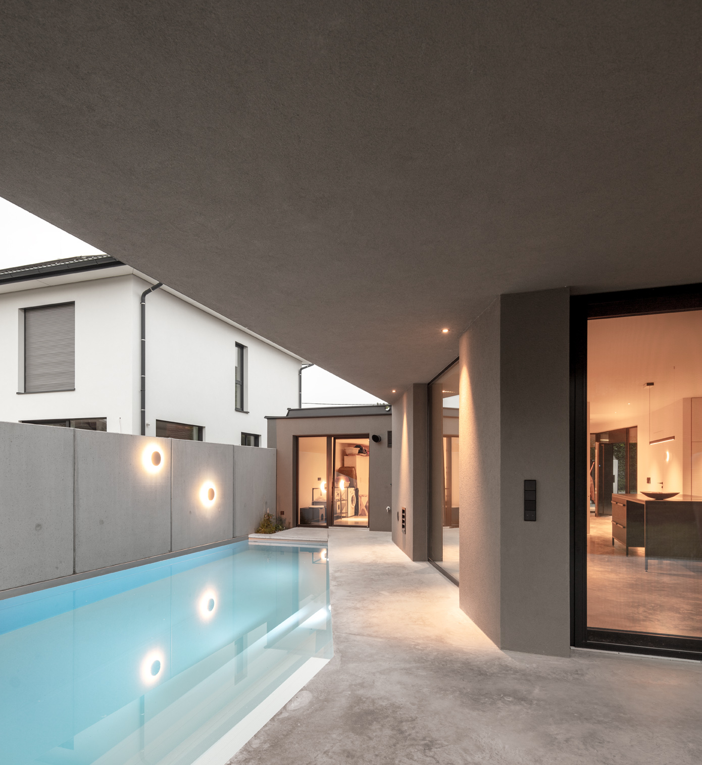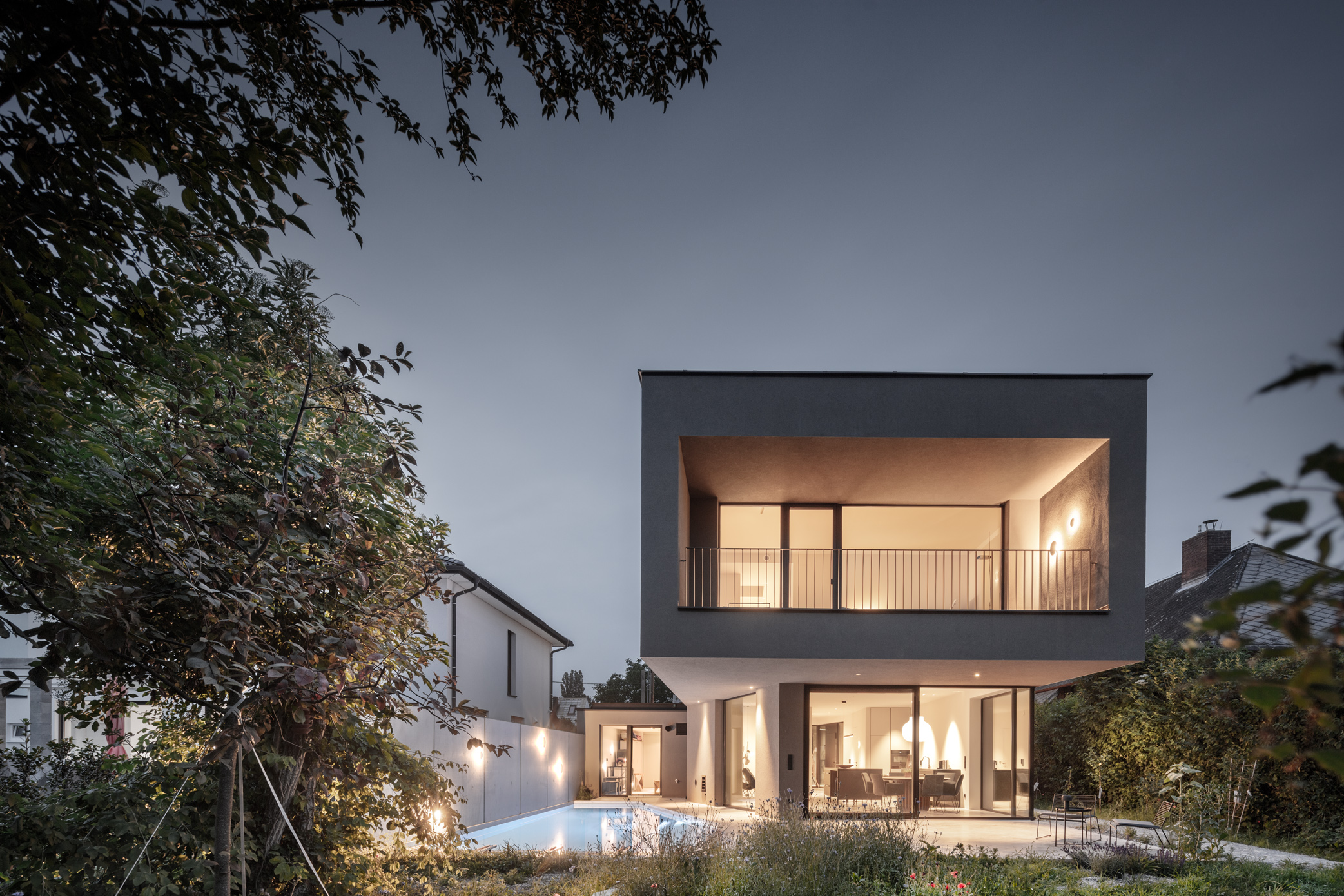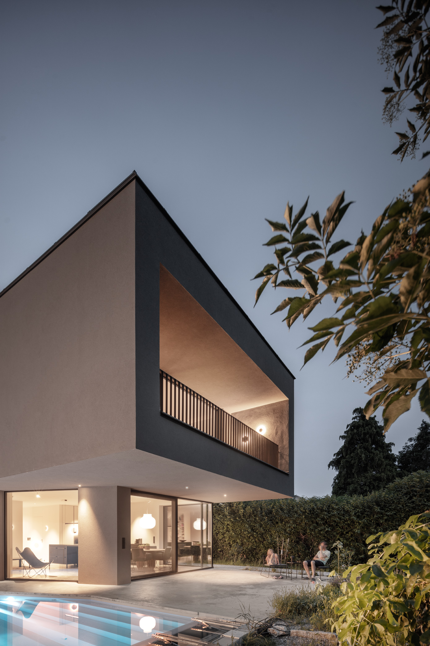 Das Haus spielt mit klaren Linien und spannenden Proportionen, die für eine zeitlose Architektur sorgen. Durch die großzügigen Glasflächen entsteht ein fließender Übergang zwischen Innen und Außen.