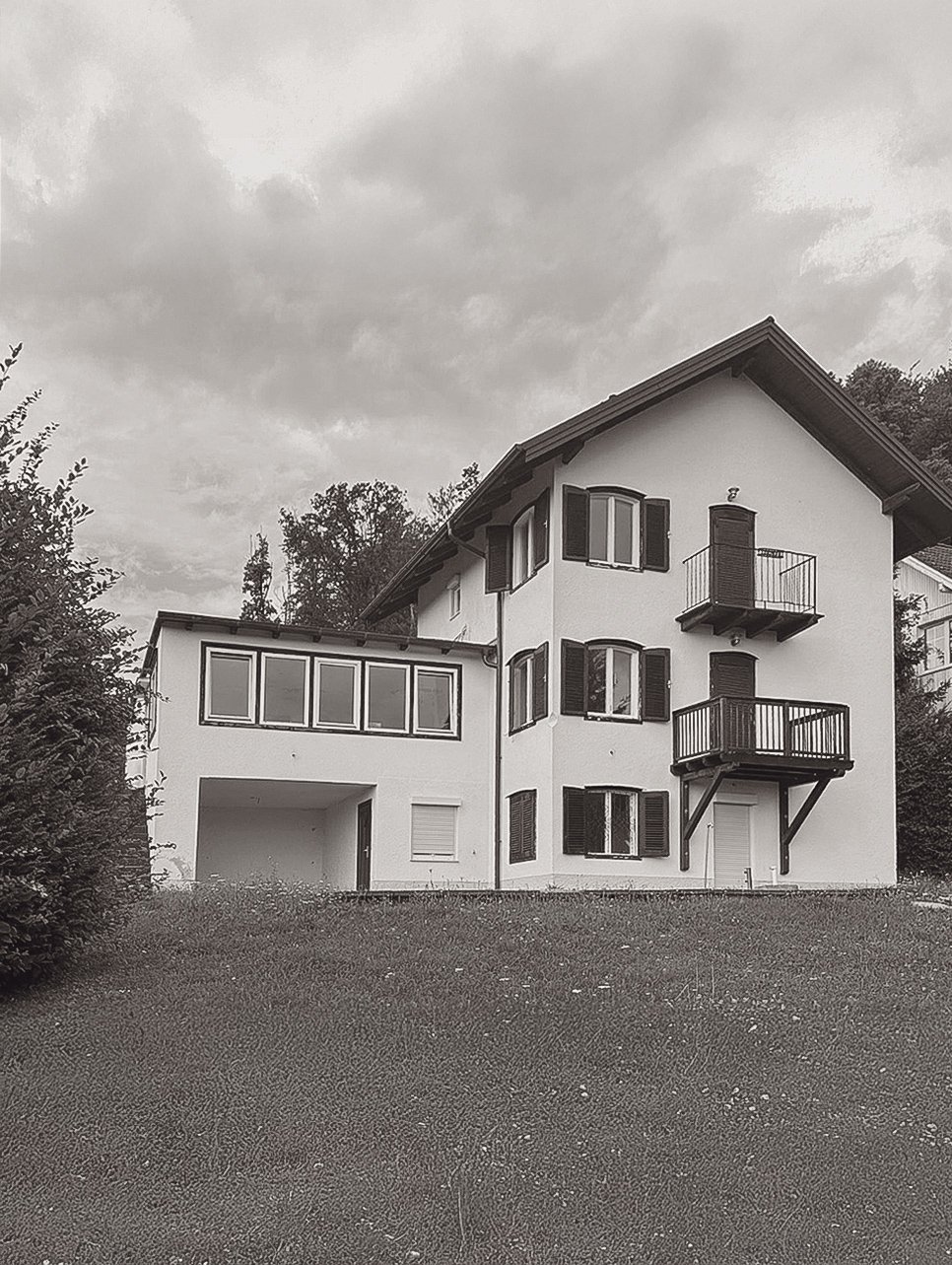 Es muss nicht immer ein kompletter Abriss am Beginn stehen. Hier wird ein bestehendes, funktionierendes Wohnhaus umfassend saniert und durch einen modernen Zubau erweitert. Der neue Baukörper setzt sich bewusst vom Bestand ab: ein massives Untergeschoss trägt eine leichte Holzkonstruktion im Obergeschoss – eine klare, rechteckige Form mit schwarzer Holzbretterschalung.