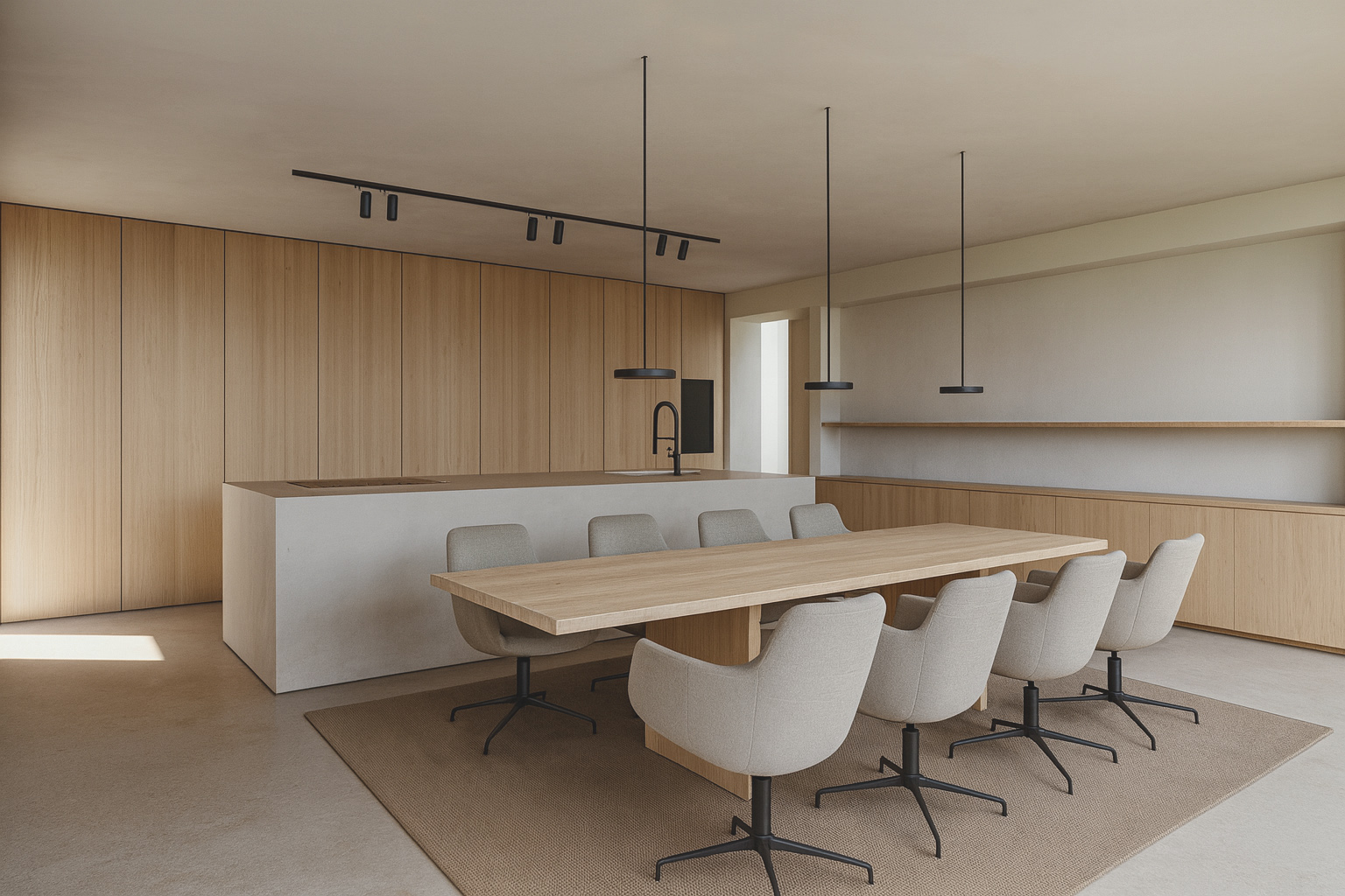 Die Architektur folgt einer skandinavisch inspirierten Sprache: wenige, ehrliche Materialien schaffen eine reduzierte, zeitlose Atmosphäre, die dennoch warm und einladend wirkt. Durch die Sanierung erstrahlt auch der optisch aufgewertete Bestand in neuer Qualität – die Verbindung von Alt und Neu ergibt ein harmonisches Gesamtbild.